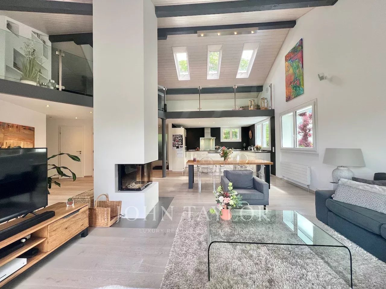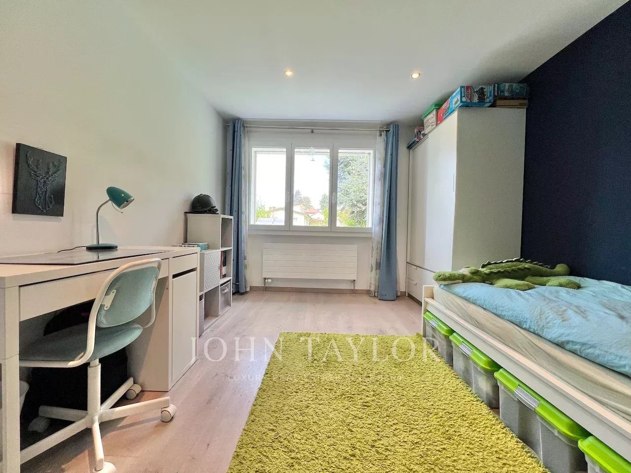 Le rez-de-chaussée s’ouvre sur une spectaculaire pièce de vie de 70 m² avec plafond cathédrale, grande baie vitrée et accès direct à la terrasse orientée lac. La partie nuit comprend 4 chambres, un dressing et une grande salle de bain familiale.