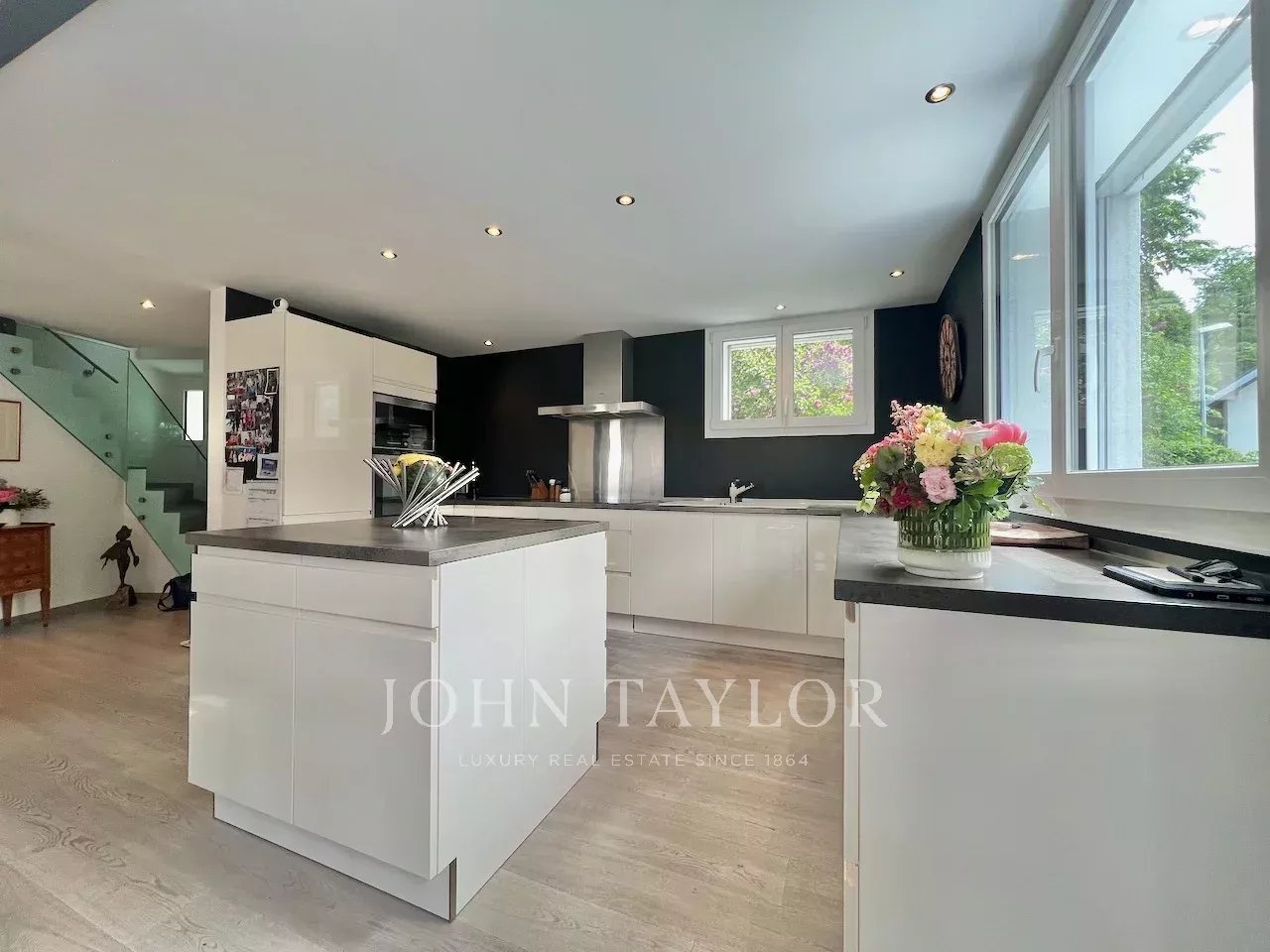 À l’extérieur, le jardin paysagé, intime et sans vis-à-vis, comprend potager, arbres fruitiers et terrasse panoramique. Deux garages indépendants chauffés complètent ce bien.