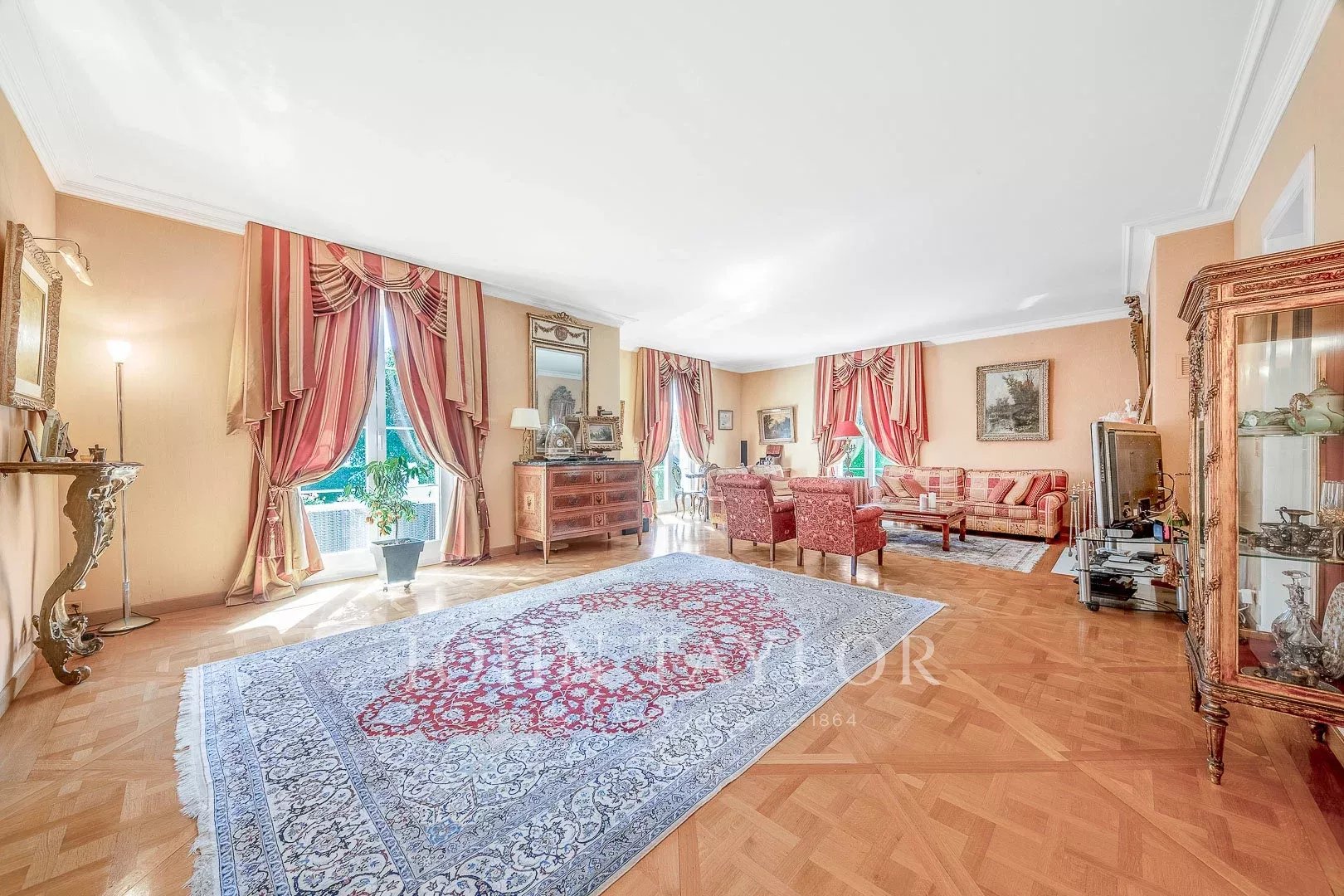 Au rez-de-chaussée, elle se compose d'un large et majestueux hall de réception, d'une cuisine entièrement équipée avec des éléments laqués et du marbre précieux, d'une salle à manger ornée de belles boiseries, d'un séjour avec cheminée, d'un bureau orné d'une bibliothèque murale ainsi que d'un accès au garage double. La plupart des pièces du rez-de-chaussée donnent accès à la belle terrasse et au jardin.