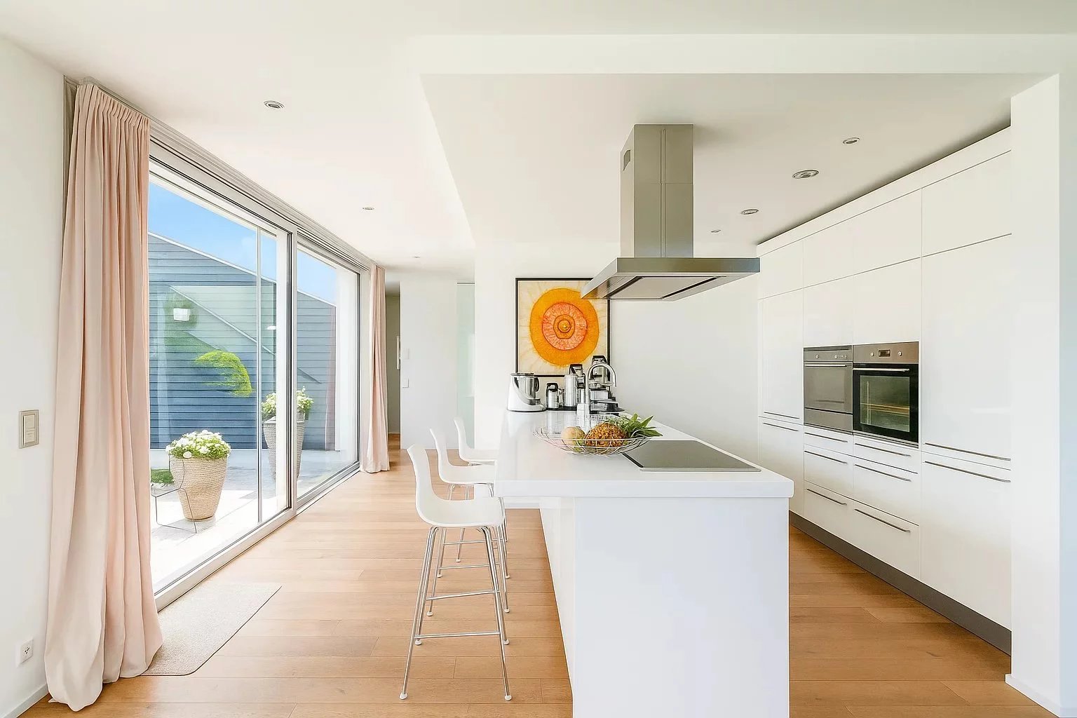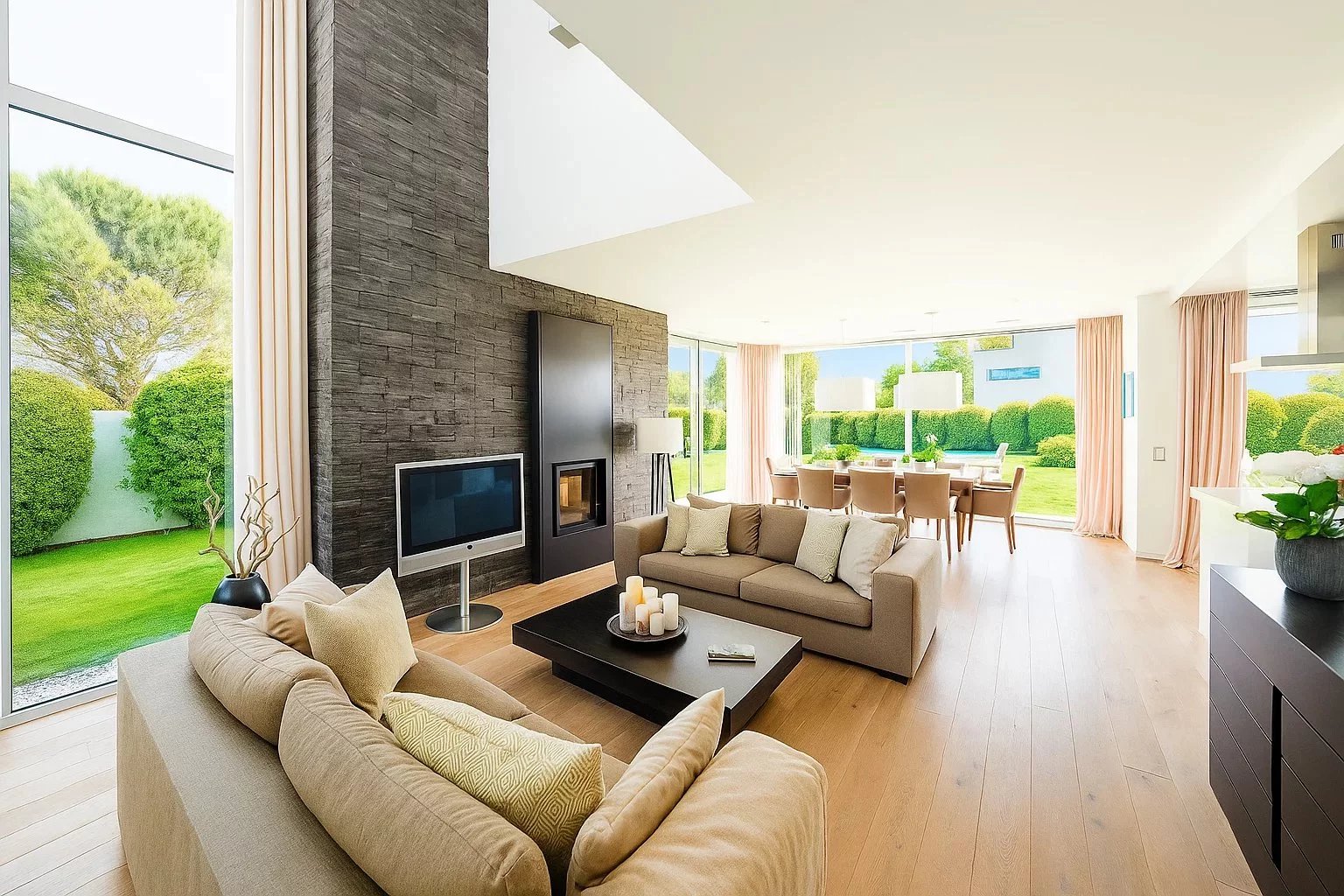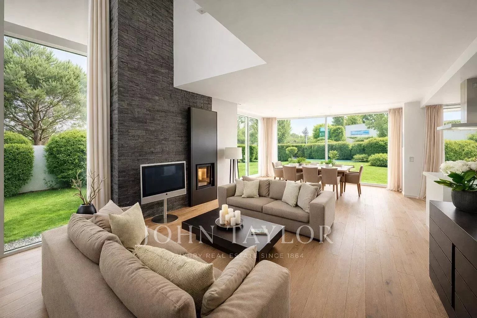 • Vaste espace de vie avec cuisine ouverte haut de gamme, grande hauteur sous plafond et accès direct à un magnifique jardin paysager