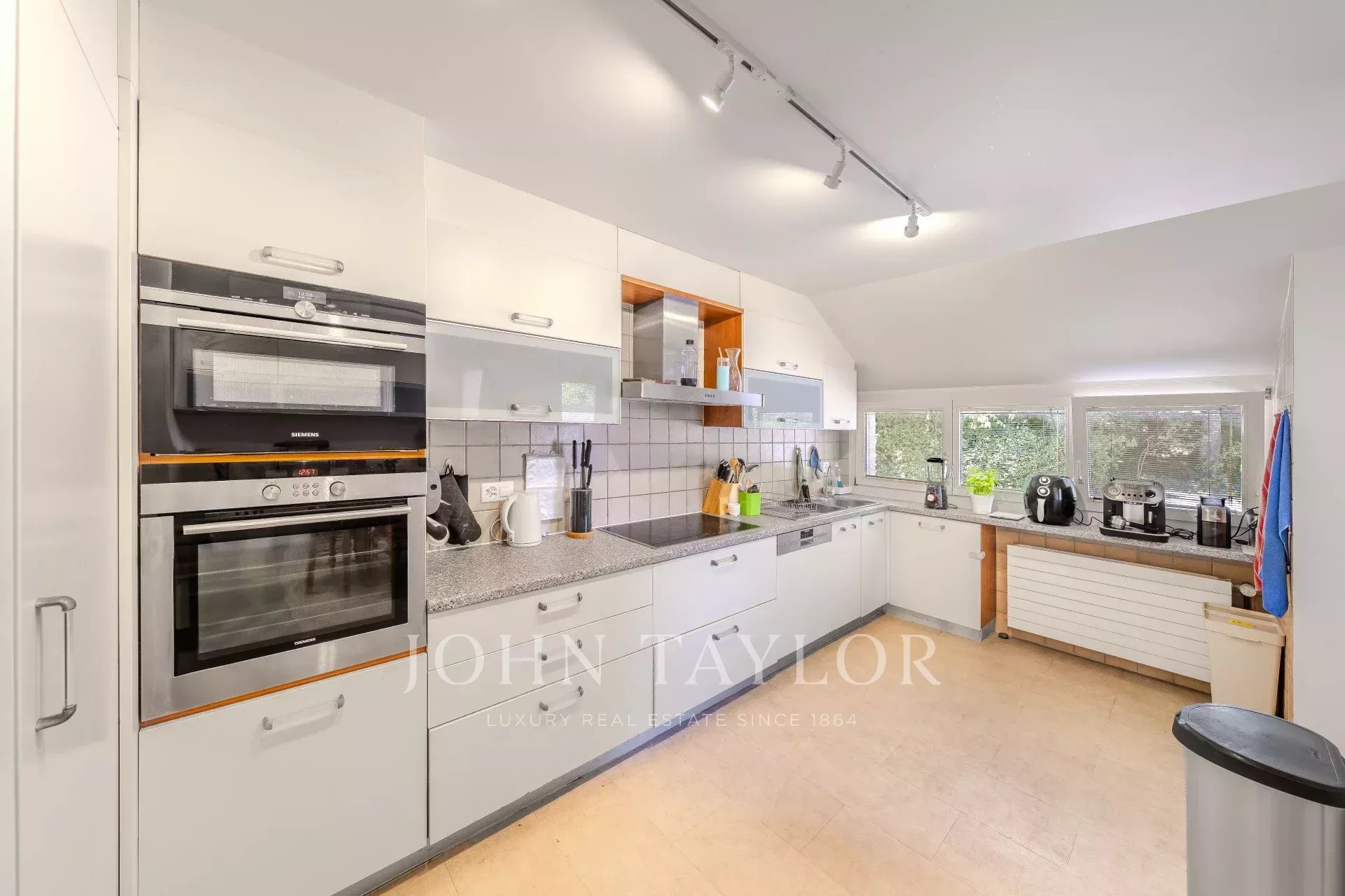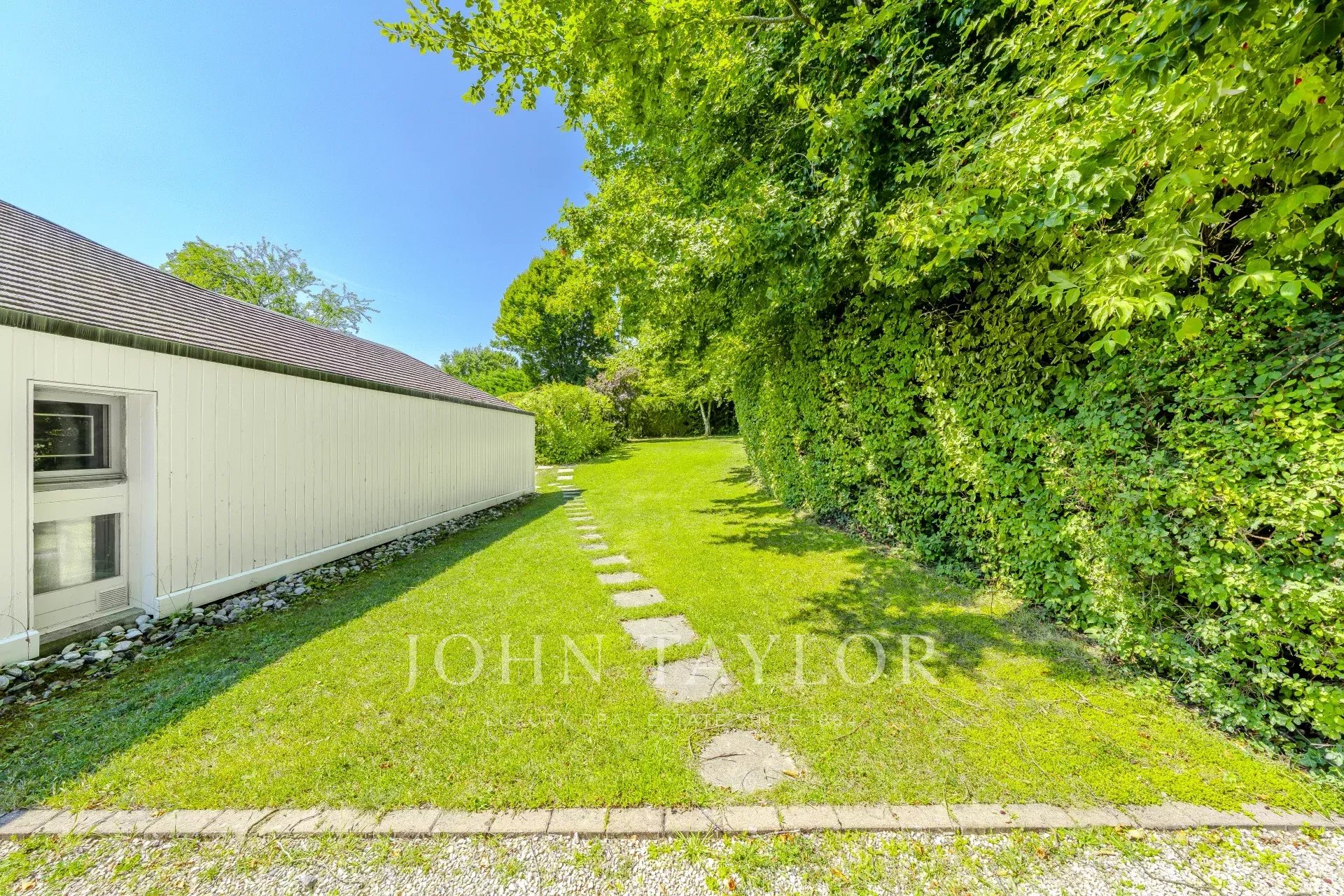 À l’extérieur, le jardin paysager avec piscine s’accompagne d’un garage double de 33 m² et d’une grande cour d’entrée.