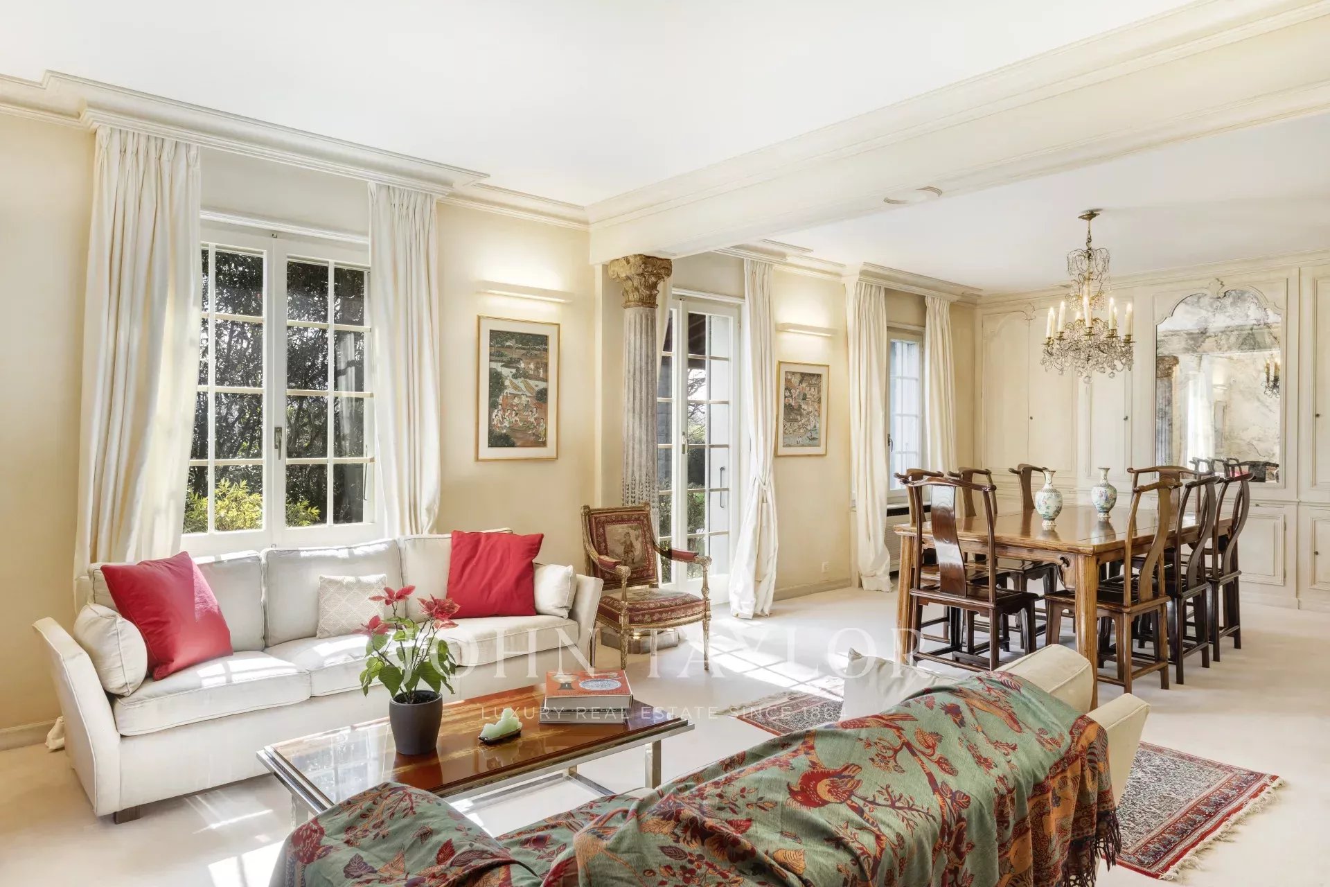 Répartie sur deux niveaux et un sous-sol, le rez-de-chaussée et sa double réception, présente deux salons, dont un vaste séjour agrémenté d'une cheminée.