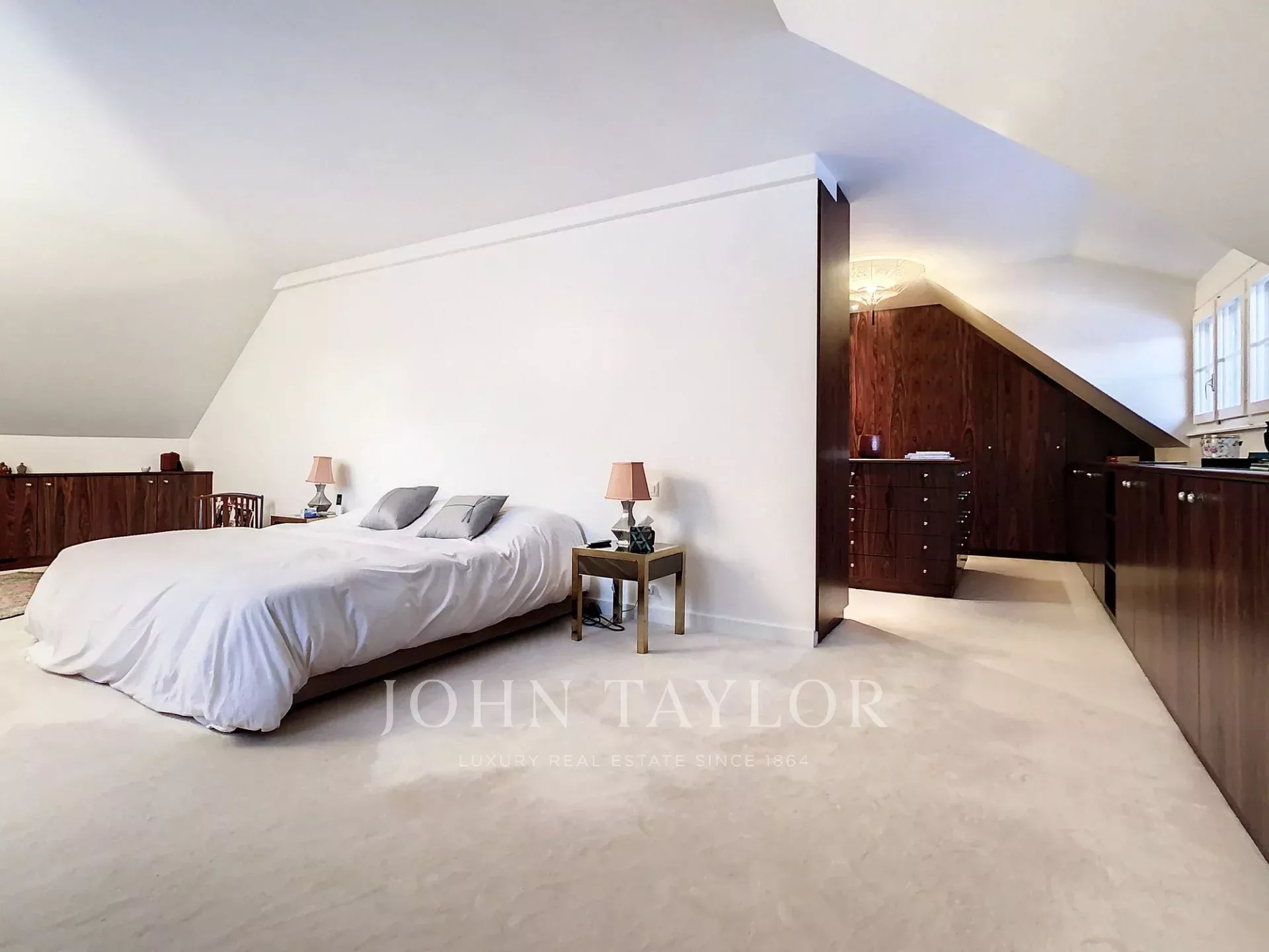 À l'étage, se trouvent plusieurs chambres à coucher, des salles de bains supplémentaires et une suite parentale avec un splendide dressing. Toutes les chambres offrent un dégagement sur le parc de la propriété.